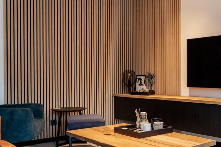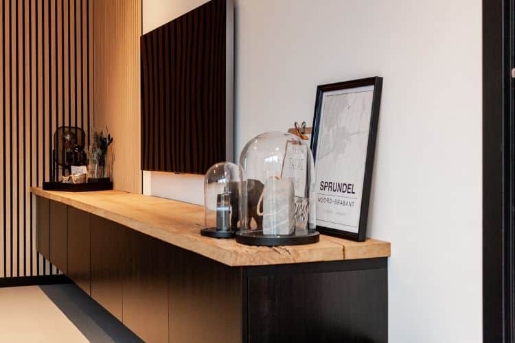 Doordat de woonkamer, eetkamer en keuken één grote open ruimte zijn, heeft de interieurontwerper voor de demping van het geluid gekozen voor een akoestisch dempend product; akupanelen. Dit product vind je terug in de hoek van het tv-meubel.