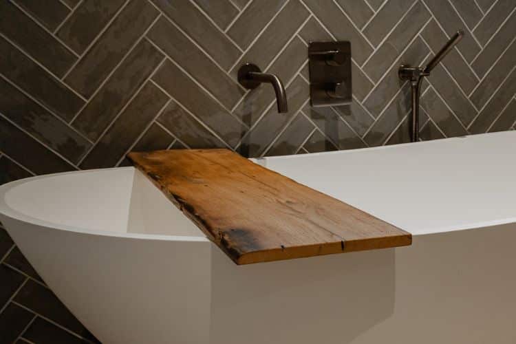 Voor op het mooie vrijstaande bad is er een bad plank gemaakt. Een plank waar je al je spulletjes op kunt neerleggen terwijl je in bad zit. Denk aan bijv. je theekop of je tablet.