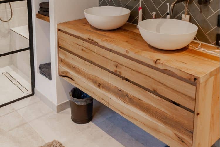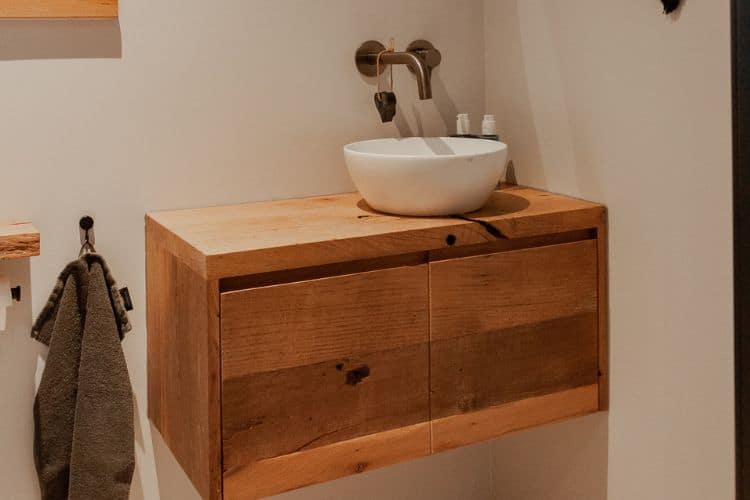 Het meubel dat je in het toilet ziet hangen is geproduceerd van Barnwood 40mm en 20mm dikte. Het meubel is voorzien van een tweetal lades die beide een softclose sluiting hebben.