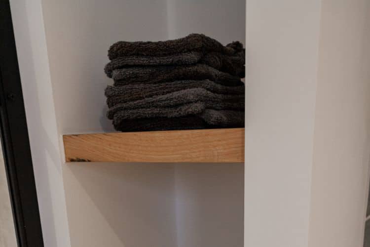Naast het badkamermeubel wilde de klant nog wat extra opbergruimte hebben. En om dit te creëren zijn er een aantal wandplanken gemaakt. Deze wandplanken zijn gemonteerd in het nisje en zorgen zo voor een extra plekje voor de handdoeken.