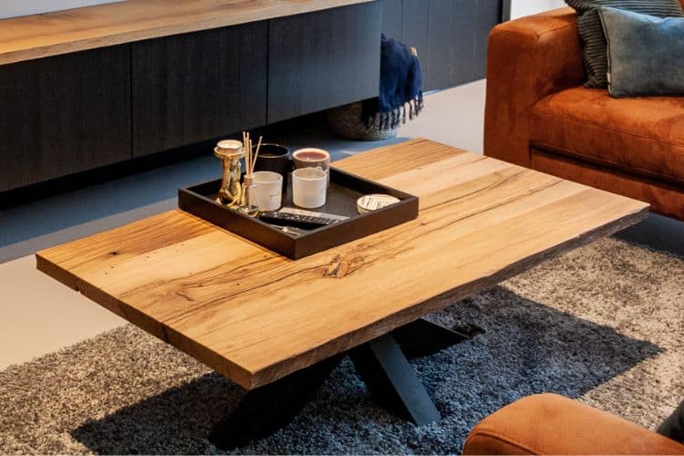 De salontafel die je hier ziet staan is een mooie combinatie van hout en staal. Het stalen frame is een matrix variant en is dekkend zwart gepoedercoat. De twee lange zijkanten van het tafelblad zijn de originele randen.