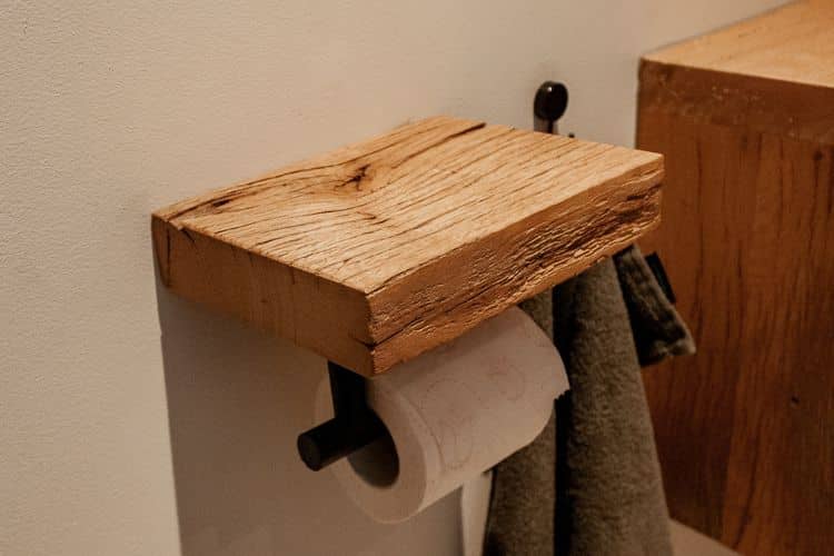 Om de ruimte helemaal in stijl af te maken is ook de wc rolhouder en het vensterbankje gemaakt van dezelfde houtsoort. Dit zowel op de begane grond als op de eerste verdieping.