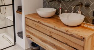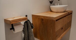 Het meubel dat je in het toilet ziet hangen is geproduceerd van Barnwood 40mm en 20mm dikte. Het meubel is voorzien van een tweetal lades die beide een softclose sluiting hebben.
