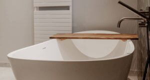 Voor op het mooie vrijstaande bad is er een bad plank gemaakt. Een plank waar je al je spulletjes op kunt neerleggen terwijl je in bad zit. Denk aan bijv. je theekop of je tablet.
