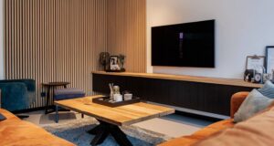 Doordat de woonkamer, eetkamer en keuken één grote open ruimte zijn, heeft de interieurontwerper voor de demping van het geluid gekozen voor een akoestisch dempend product; akupanelen. Dit product vind je terug in de hoek van het tv-meubel.